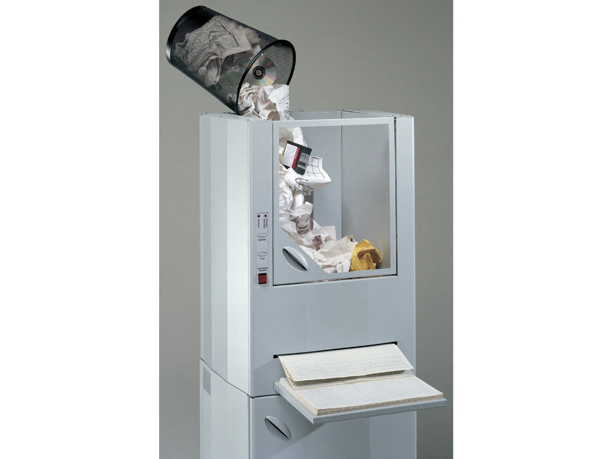 Kobra 400 WB is a centralized heavy duty shredder for bulk shredding requirements of large offices and departments. Insert the paper into the feeding slot or empty the basket into the large hopper. The automatic feeding system with mechanical revolving flaps will do the shredding job for you. The 16-inch wide throat with a hopper shreds up to 48 sheets at a time into 1/8 x 1 1/2 inch tiny particles.