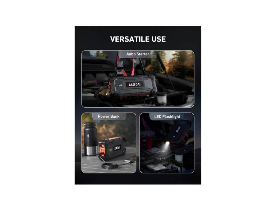 Power up your vehicle anytime, anywhere with the AstroAI S8 Ultra Jump Starter, delivering a massive 4000A peak current to jump-start even the most demanding engines. This all-in-one power solution is built for reliability, safety, and convenience — perfect for cars, trucks, SUVs, boats, motorcycles, and more.