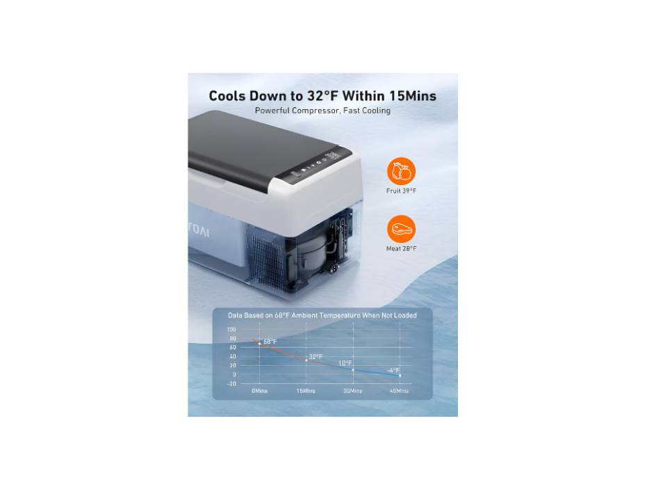 • Fast Cooling Technology Powerful compressor cools to 32℉ in just 15 minutes (empty), reaching -4℉ in under an hour. Choose between MAX mode for rapid cooling or ECO mode for energy efficiency.