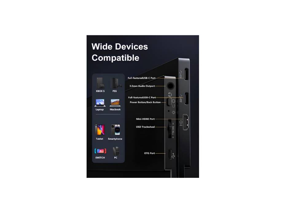 Dual USB-C & Mini HDMI Ports:Plug-and-play compatibility with laptops, MacBooks, smartphones, PS4/PS5, Xbox, Switch, and more. Requires only one USB-C cable for power and video with compatible devices.