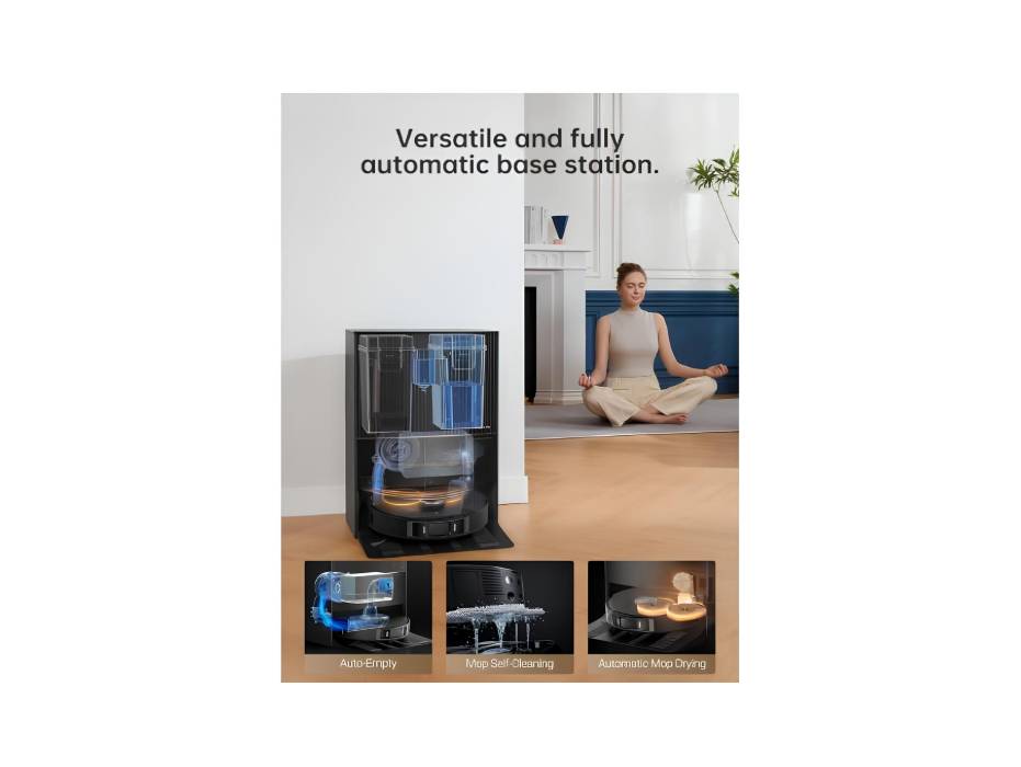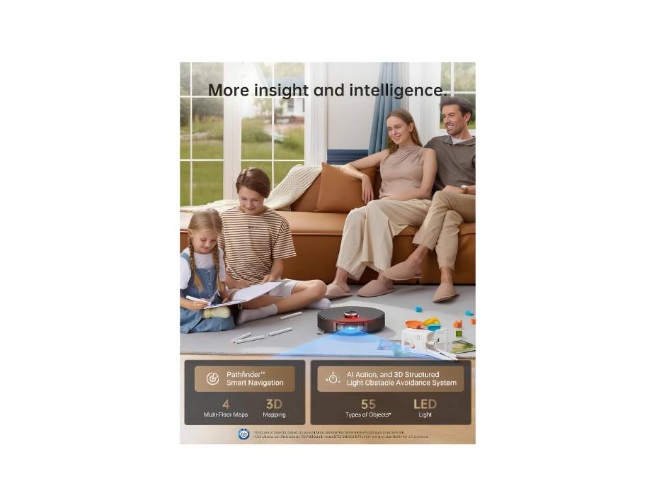 Uses AI and 3D structured light to detect and avoid small objects, cables, and furniture in real-time.