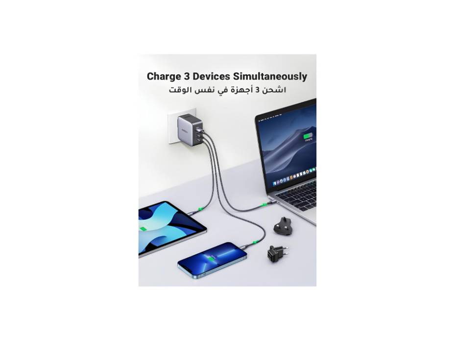 • 3-Port Design (2×USB-C + 1×USB-A) Simultaneously charge your laptop, tablet, and phone at full speed—no more waiting in line for outlets.