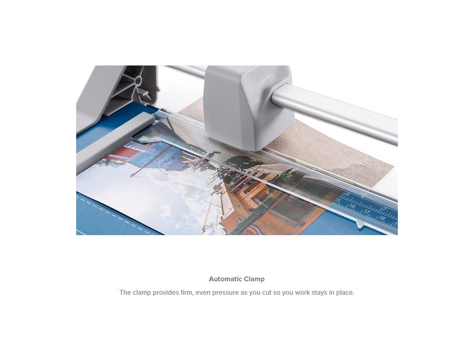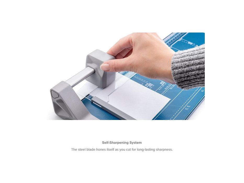The Dahle 507 Personal Rotary Trimmer with a 12" cut length is lightweight and portable for just about any application. It features a ground self-sharpening blade that cuts in both directions, a triangular aluminum guide bar for strength, and an automatic clamp to prevent your work from shifting.