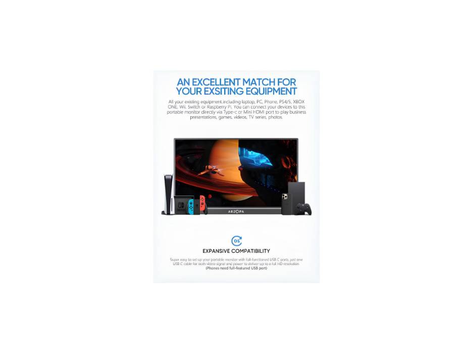 Take your work on-the-go with the ARZOPA Portable Monitor! Featuring a 17.3 inch 1080P FHD IPS display, this monitor offers crystal clear visuals and a kickstand for comfortable viewing. Connect easily with HDMI and USB C ports, and enjoy immersive sound with built-in dual speakers. Take productivity to the next level with this portable monitor.