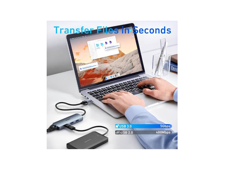 High-Speed USB 3.0 HubThree USB 3.0 ports provide data transfer speeds of up to 5Gbps, perfect for external drives, keyboards, mice, and printers.