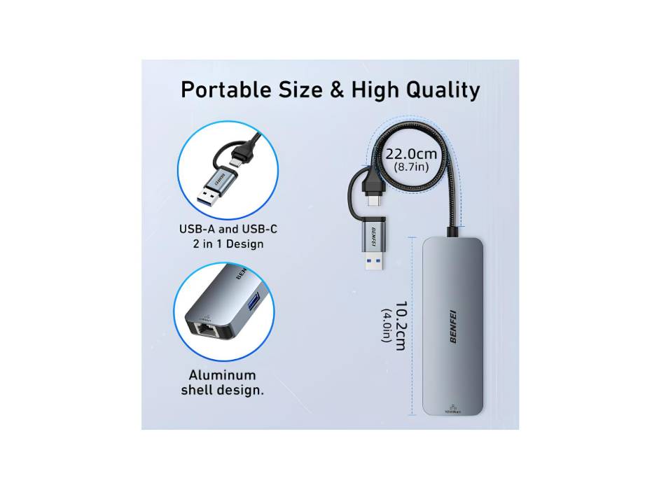 The BENFEI 5-in-1 USB-C/USB 3.0 to Gigabit Ethernet Adapter combines fast wired internet with expanded connectivity. Featuring a Gigabit RJ45 port and three USB 3.0 ports, it’s the perfect solution for laptops, tablets, and modern devices that need reliable network access and multiple peripheral connections.