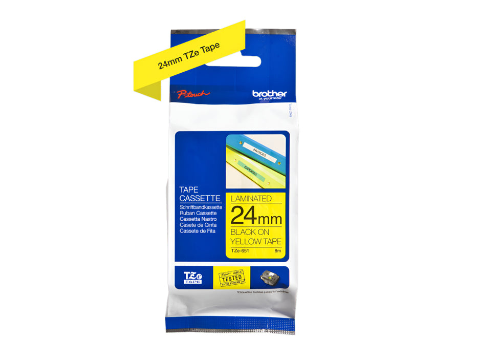 Unleash your creativity with the Brother P-Touch TZ-651 Laminated Tape, featuring an eye-catching black print on a vibrant yellow background. This 24mm wide tape is perfect for creating bold, clear labels that stand out in any environment. Ideal for both home and professional use, the TZ-651 is designed to make your labeling tasks effortless and effective, ensuring maximum visibility for all your important items.