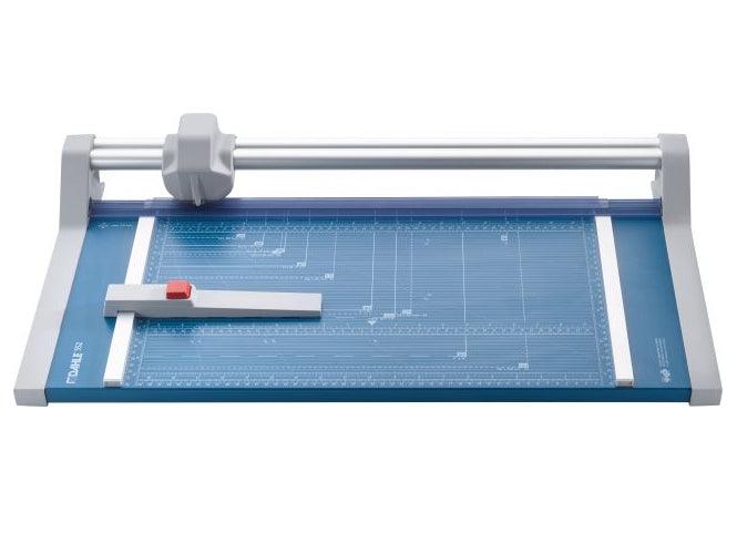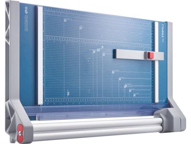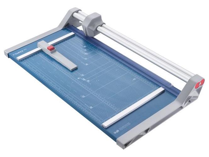 The Dahle 552 Professional Rotary Trimmer with a 20" cut length is designed for precision and accuracy. It features a ground self-sharpening blade that cuts in both directions, a Dual-barrel guide bar for strength, and an automatic clamp to prevent shifting. This German engineered cutter is ultra-precise and ideal for trimming paper, photos, and cardstock.