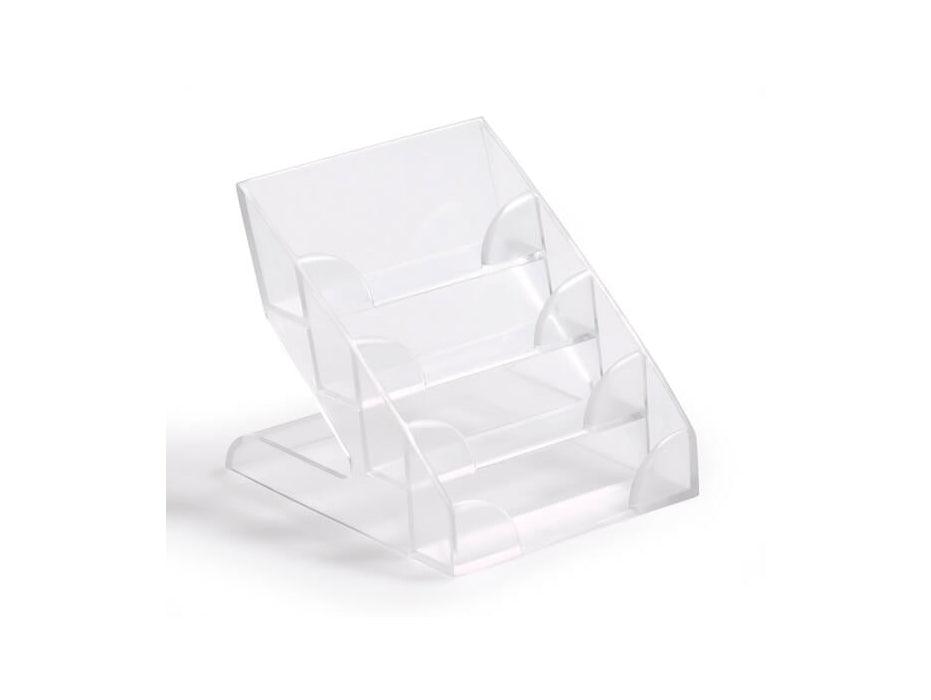 Transparent plastic business card display box with four compartments for the storage of up to 240 business cards.