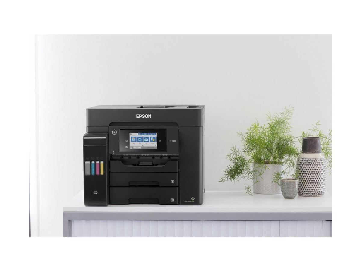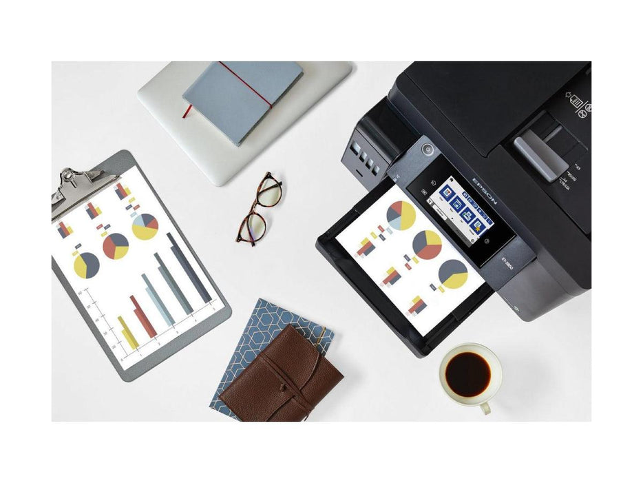 Print, scan, copy and fax will this easy-to-use EcoTank printer, that delivers an exceptionally low cost per page. Tasks can be accomplished quickly thanks to fast print and scan speeds, two 250-sheet front trays, a 50-sheet rear feed, and a 50-sheet ADF. Print how you like with mobile printing, Ethernet, and a 10.9cm LCD touchscreen.
