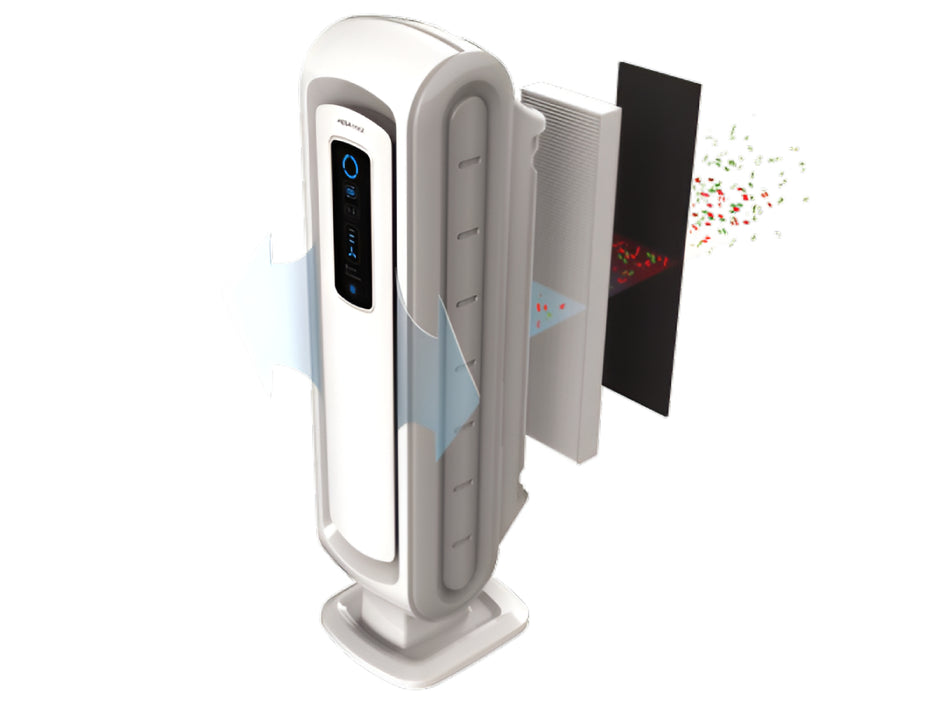 > True HEPA filter with AeraSafe™ antimicrobial treatment safely removes 99.97% of airborne particles as small as 0.3 microns, including pollen, ragweed and other allergens, viruses, germs, dust mites, mold spores and cigarette smoke