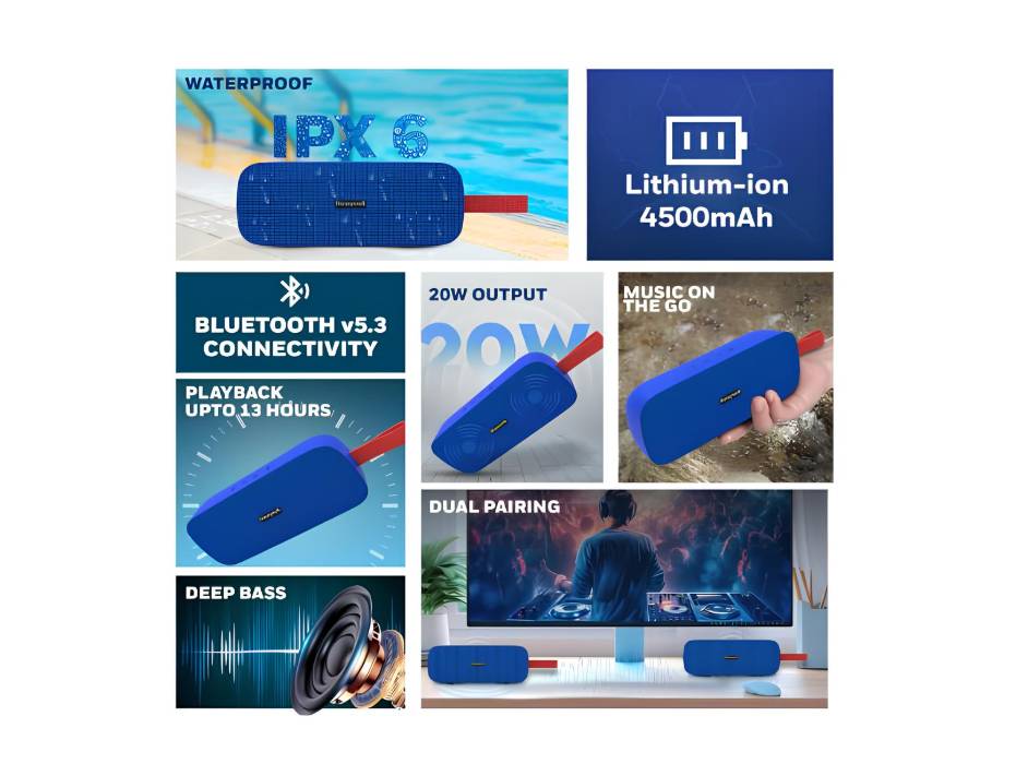Honeywell Trueno U300 20W 5.3 Bluetooth Speaker, Deep Bass Radiators,13H Playtime, IPX 6,TWS Feature, SD Card, USB Type-C Port, AUX, Built-in Mic and 78mm*2 Drivers