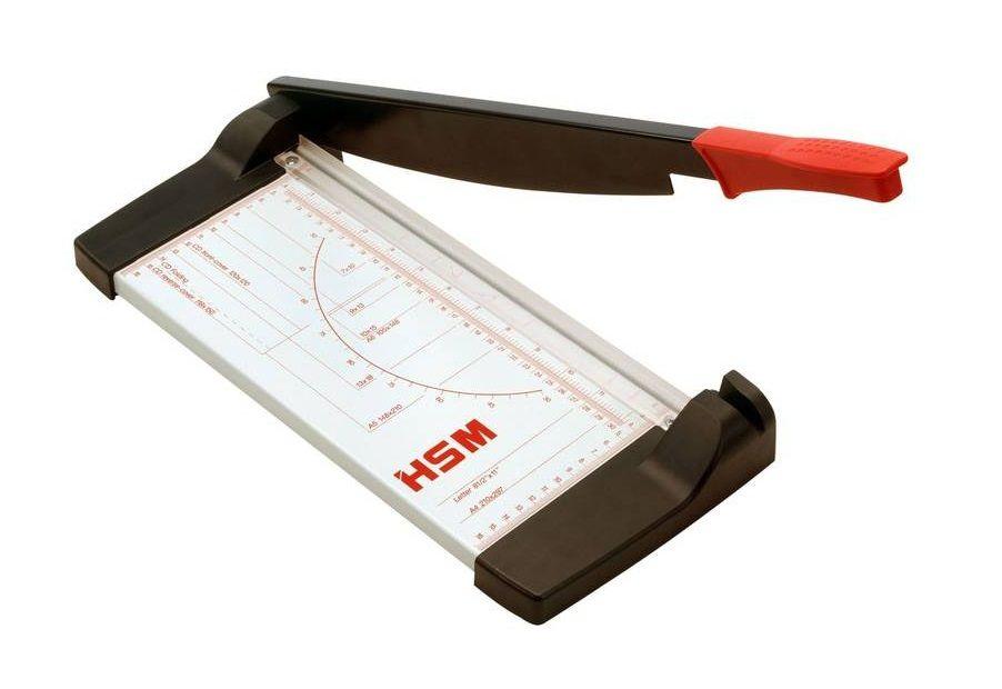 HSM CM3206 Guillotine Paper Cutter, A4 size, 549mm x 194mm x 62mm (LWH) Cutting length in mm 320 Max. paper size in DIN A4, A3 Landscape Paper thickness, 70 g/m² in mm 0,6 Cutting capacity per run, 70 g/m², in sheets 6 Machine weight in kg 0,9 Dimensions of machine L x W x H in mm 549 x 194 x 62