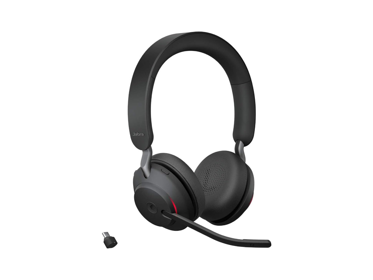 - Scope of delivery: Jabra Evolve2 65 wireless on-ear headset, USB-A Bluetooth adapter, 1.2m USB-C to USB-A cable, soft pouch