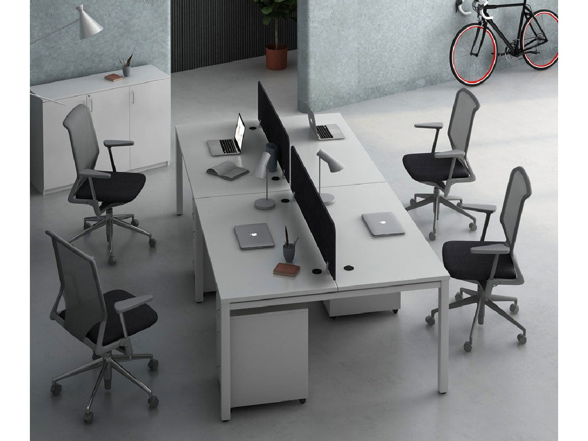 Ideal for teams, this workstation cluster promotes interaction and teamwork while optimizing space. The addition of mobile pedestals ensures organized storage, reducing clutter and enhancing productivity. Perfect for open-plan offices, the OXO Cluster is a functional and stylish solution for growing businesses.