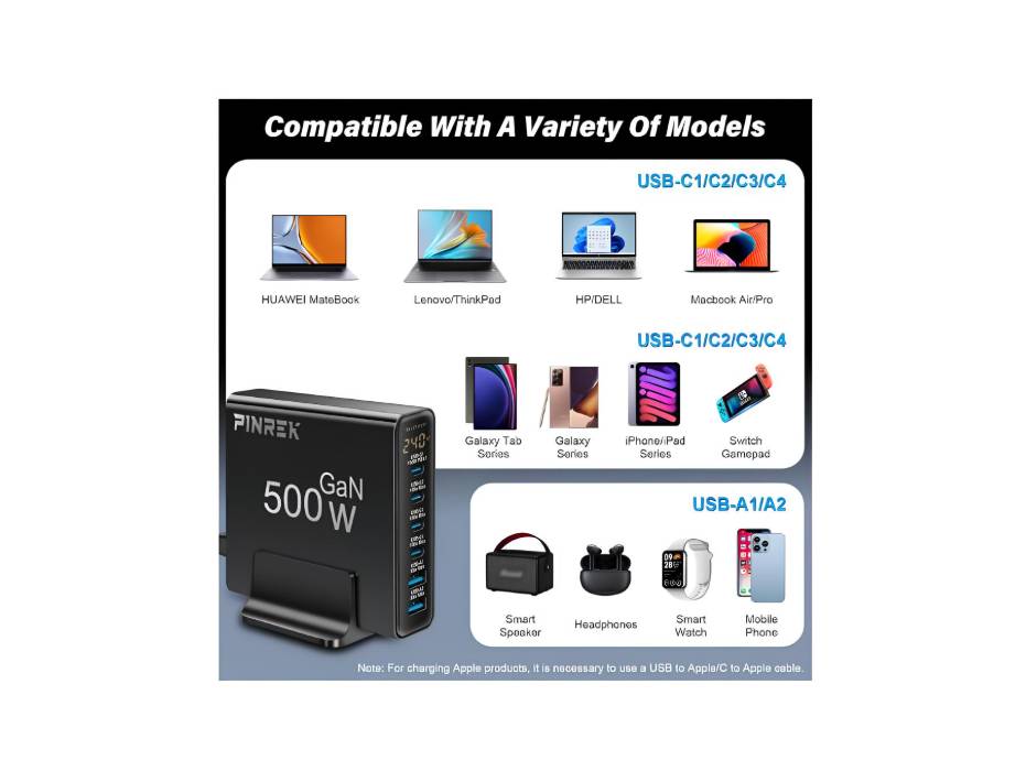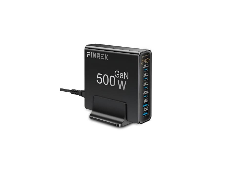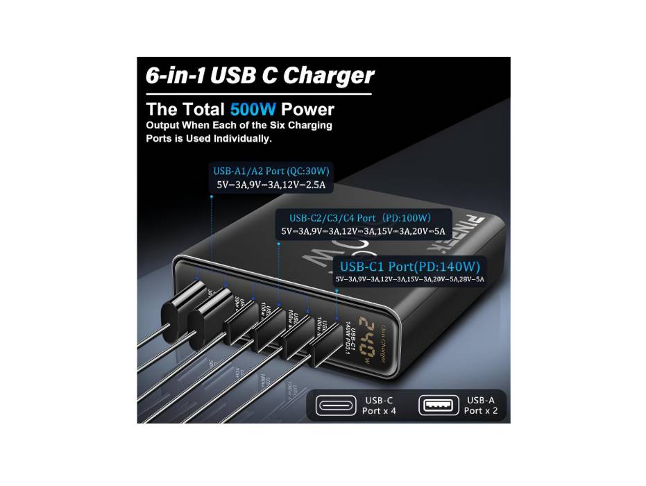 PINREK 500W 6-Port Fast Charging Station: 240W Total Output USB-C Charger with LED Display, Max 140W Power Delivery GAN Type C