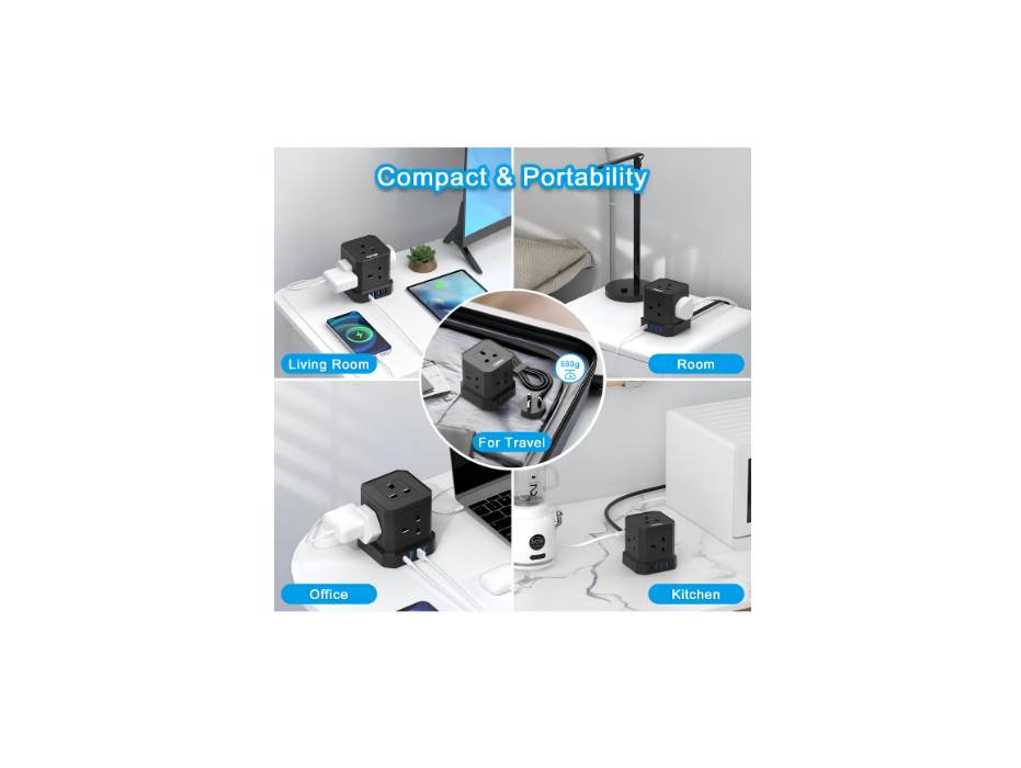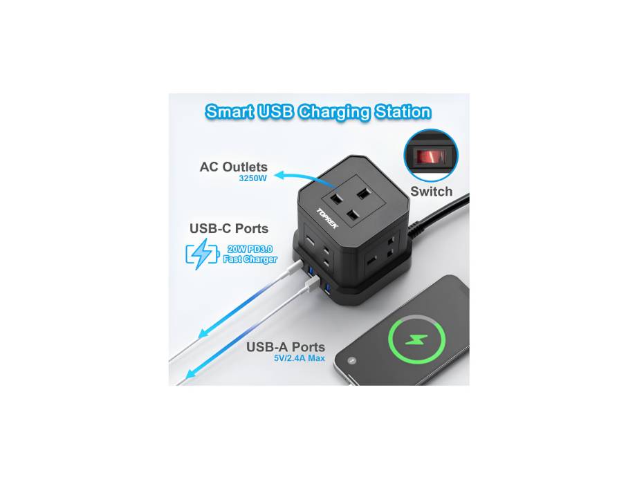 Power up your desk, nightstand, or travel kit with the TOPREK Cube Extension Lead—a space-saving solution that combines five AC outlets with four USB ports, including a 20W USB-C PD3.0 fast charger. Designed for convenience, safety, and style, this cube-shaped power strip keeps all your devices charged and organized.